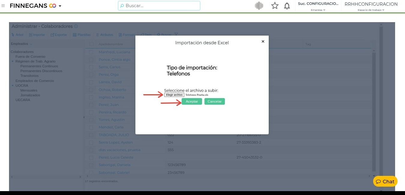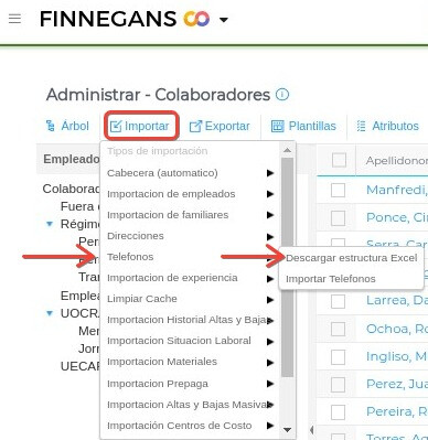 5- Regresar a Gestión de talento Humano → Administración del Colaborador → Colaboradores → Administrar → Importar → Teléfonos → Importar Teléfonos.