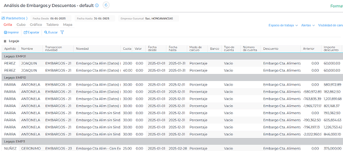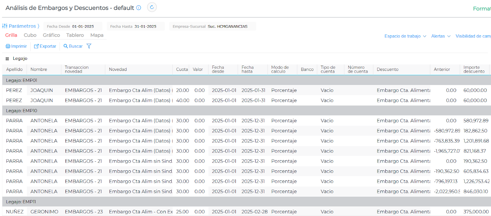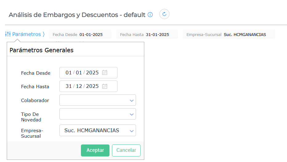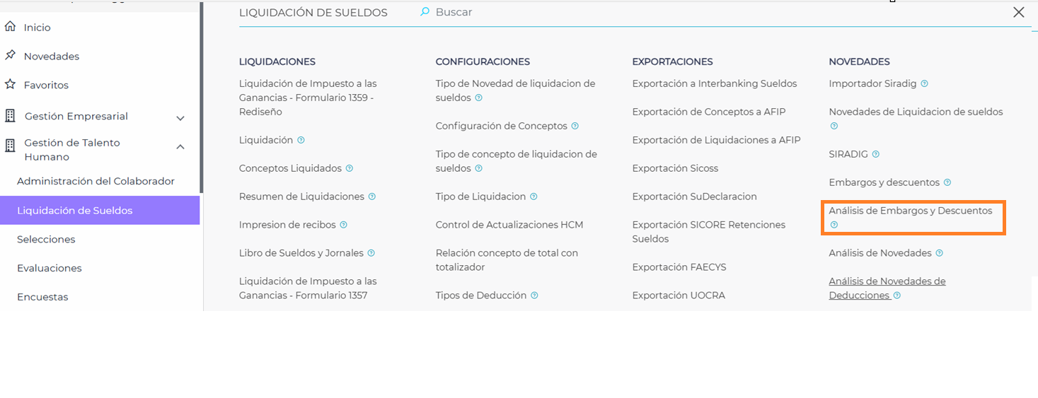 - Opción Menú → Gestión de Capital Humano → Liquidación de Sueldos → Novedades → Análisis de Embargos y Descuentos