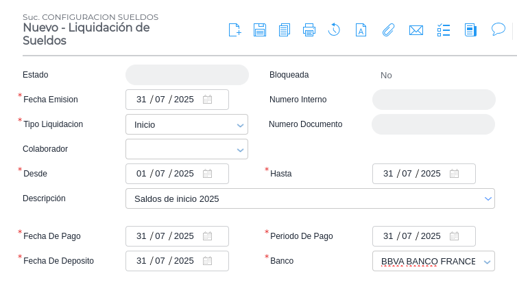 - Fecha de emisión: algún día dentro del mes donde vamos a realizar la liquidación de inicio. (Ejemplo 30/07/2025)