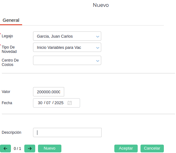 En Tipo de novedad, buscar el concepto correspondiente (ej.: Inicio Variables para Vac)