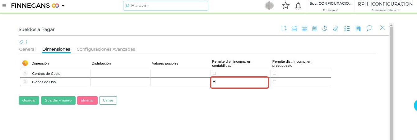 En caso de que no sea una dimensión obligatoria se puede, o quitar dicho ítem, o hacer clic en la opción “Permite dist. incomp. en contabilidad”