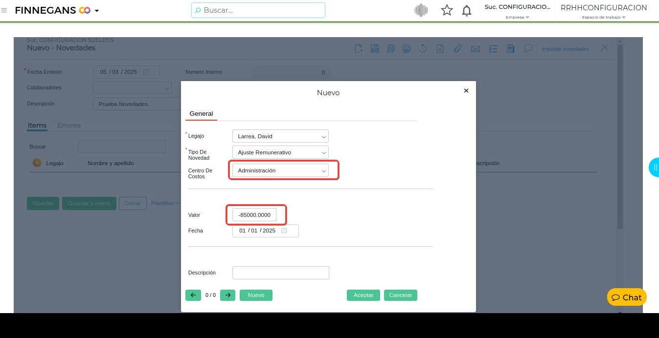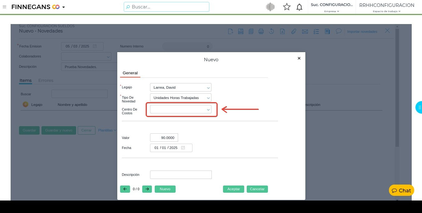- Si la novedad tiene centro de costo, revisar que la misma no sea un importe con signo negativo (-)