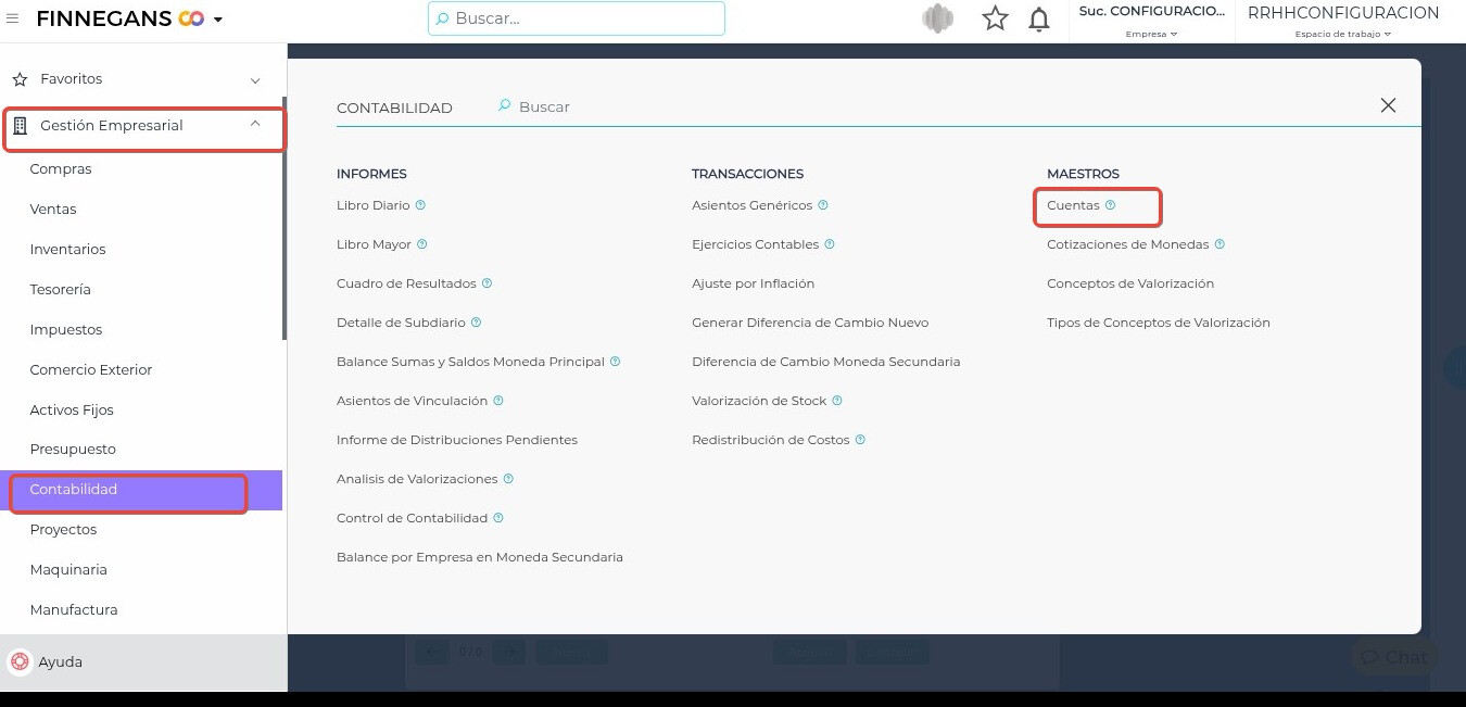 - Acceder desde el menú → Gestión empresarial → Contabilidad → Cuentas.