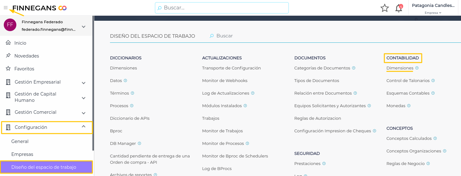 Ingresar al Menú > Configuración > Diseño de espacio de trabajo > Contabilidad > Dimensiones.