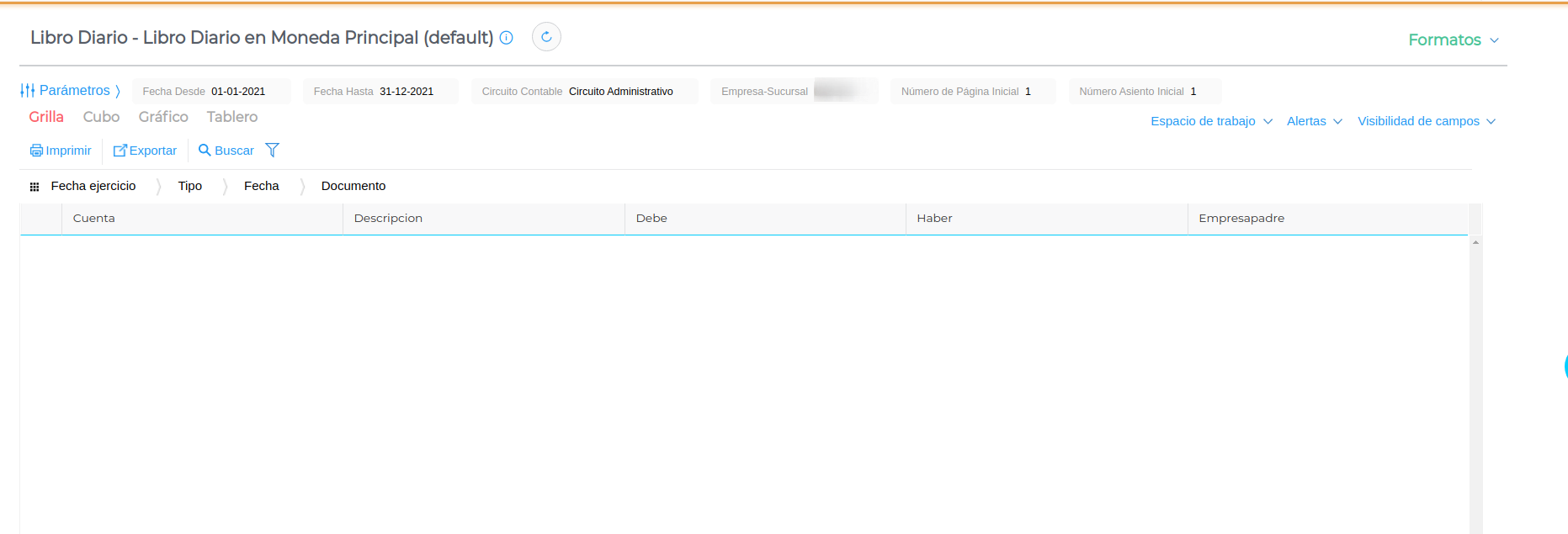Al consultar un libro diario desde Menú > Gestión Empresarial > Contabilidad > Libro diario y solo indicar fechas determinadas y un circuito contable en los parámetros, el sistema no carga ningún tipo de información.