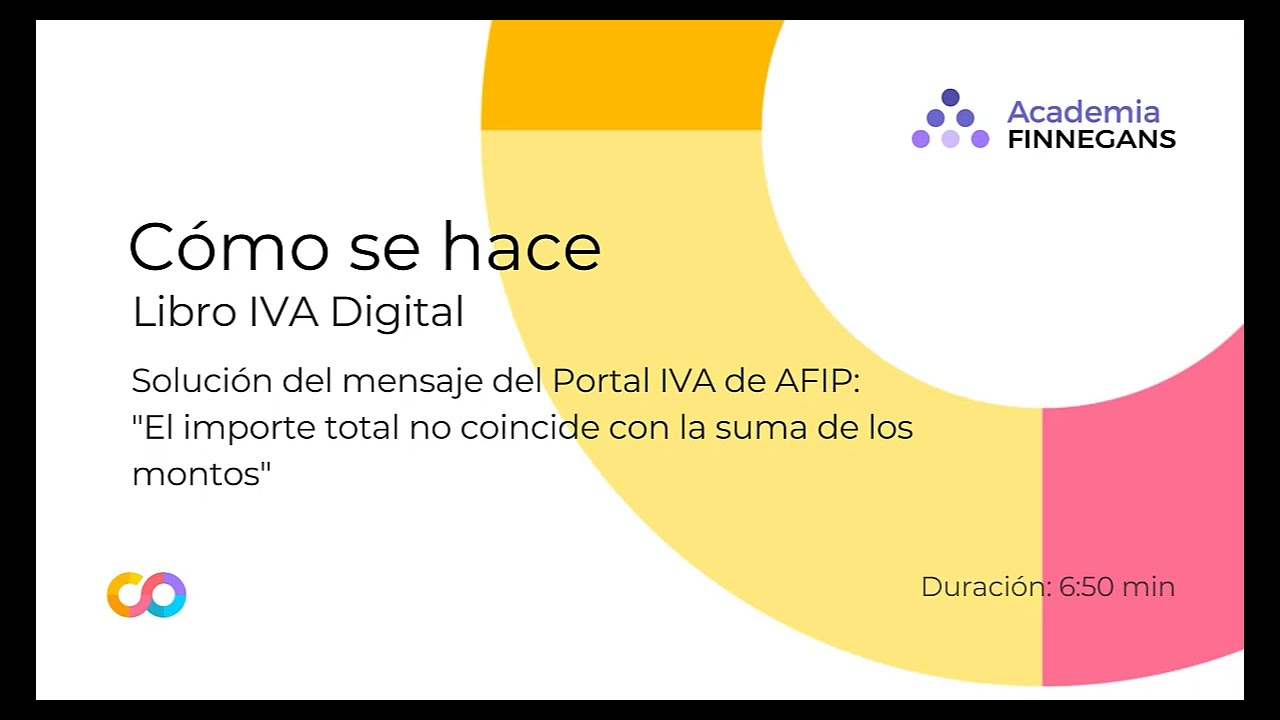 En este video vamos a ver cómo solucionar desde Finnegans GO el mensaje del Portal IVA de AFIP, “El importe total no coincide con la suma de los demás montos” al realizar Libro IVA Digital.