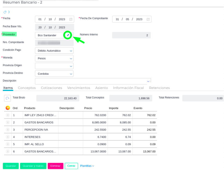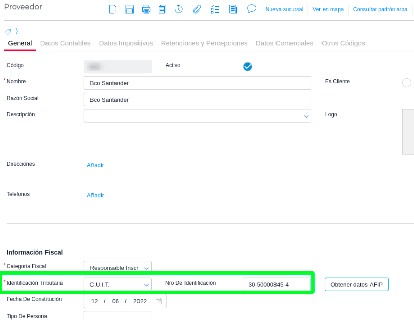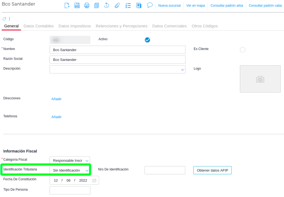 Chequear en cada resumen bancario los proveedores asignados e ingresar a la configuración del mismo para verificar que tenga asignado una identificación tributaria correspondiente a su categoría fiscal.