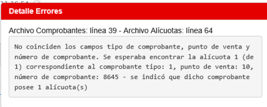 Mensaje: “Archivo Comprobante línea 2 - Archivo Alícuota línea 1”