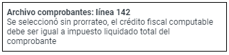 Mensaje: “Se seleccionó sin prorrateo, el crédito fiscal computable debe ser igual a impuesto liquidado total del comprobante”