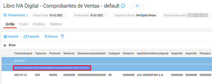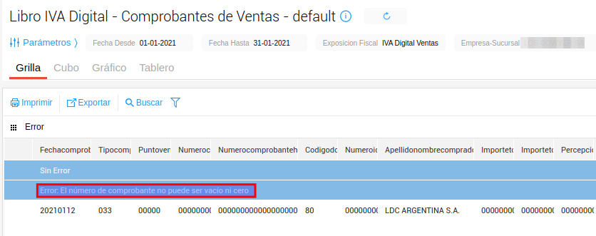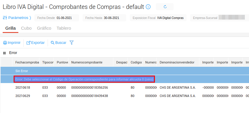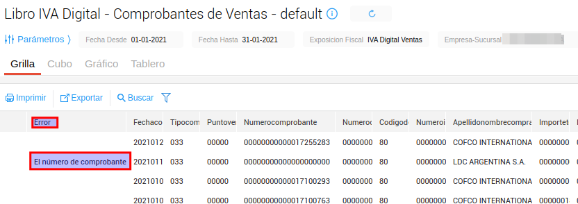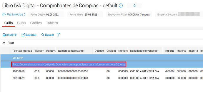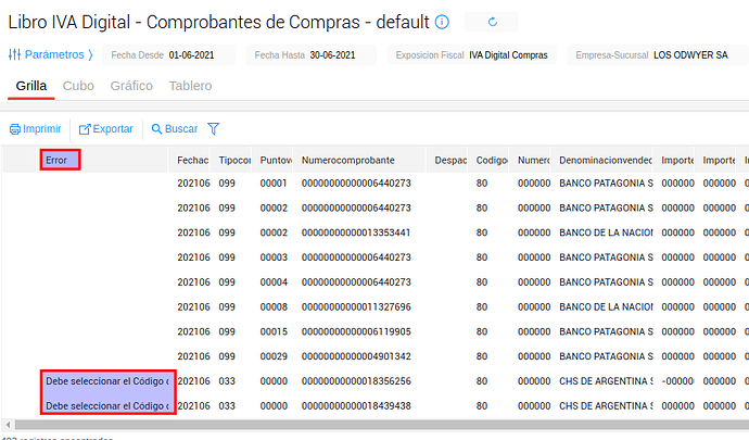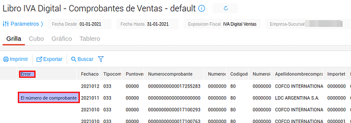 Una vez que el reporte muestre los datos que brinda la exposición fiscal, verificar la columna error para visualizar si alguna línea contiene errores. Por ejemplo: