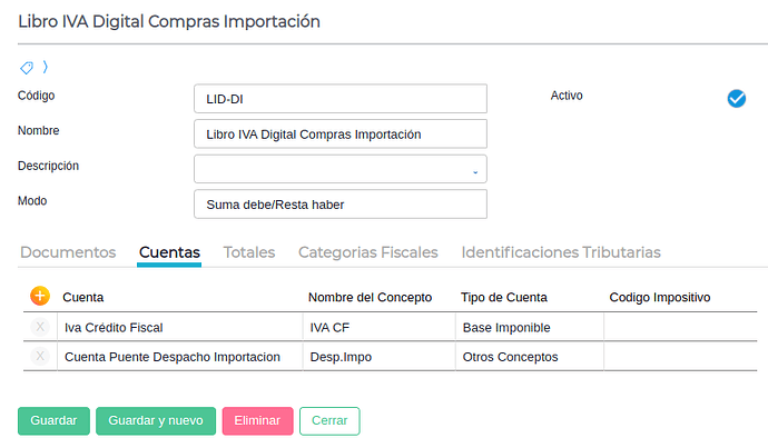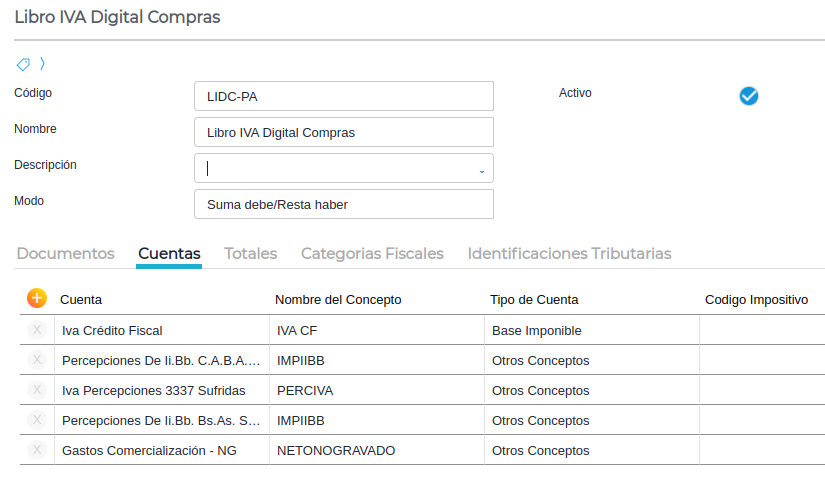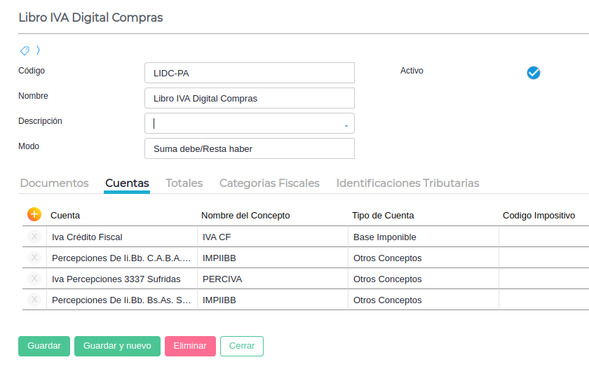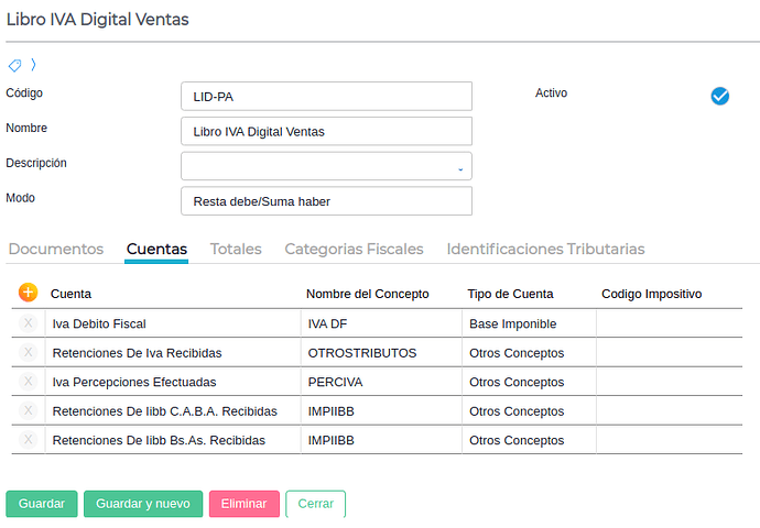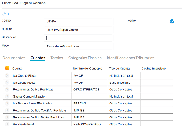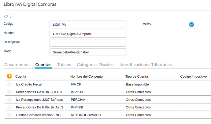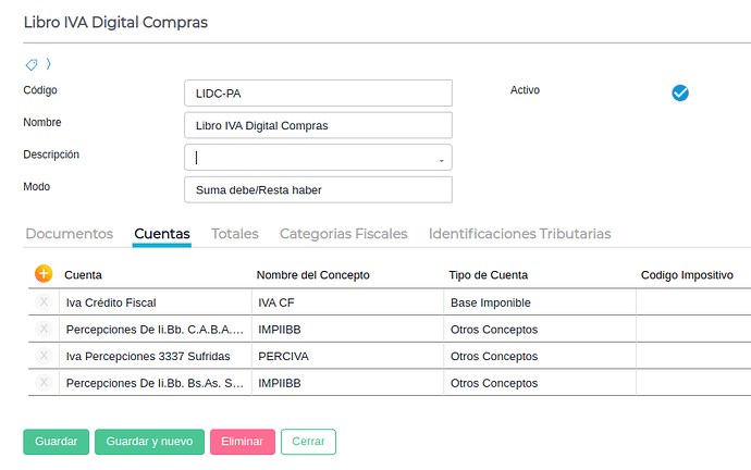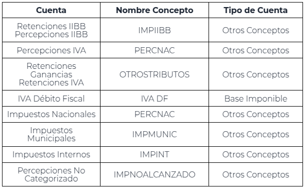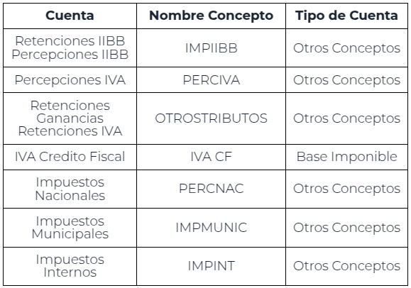 Se deben agregar todas las cuentas contables, tanto la que corresponde al IVA como a las percepciones y retenciones.
