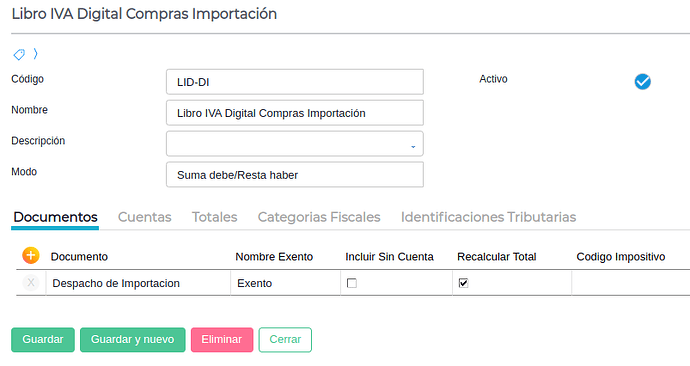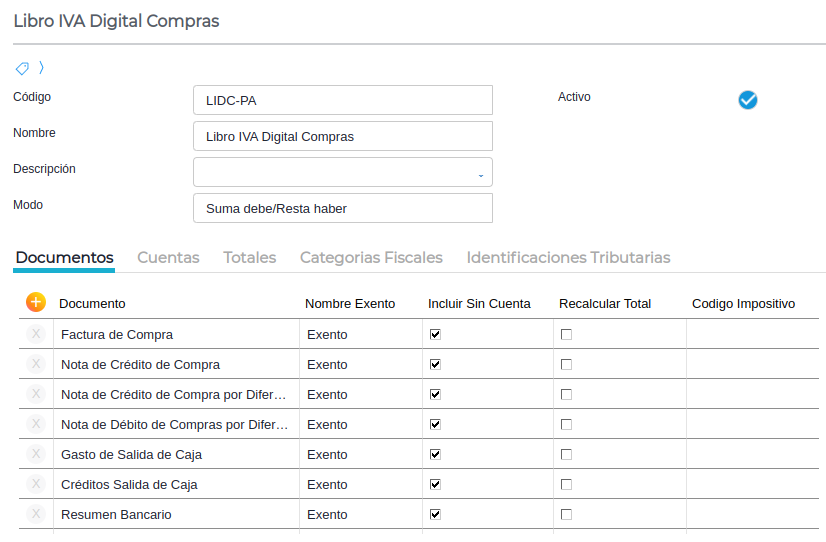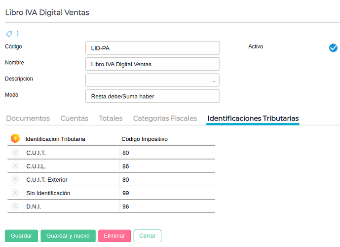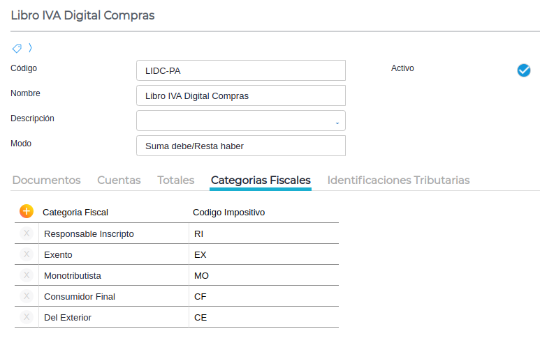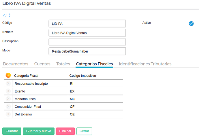 Se deben agregar todas las categorías fiscales con sus respectivos códigos impositivos.