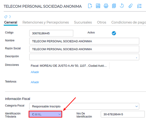 En caso de que utilicen clientes Responsable Inscripto FCE (Grandes Contribuyentes) se debe agregar la categoría fiscal con el código impositivo “RI”.