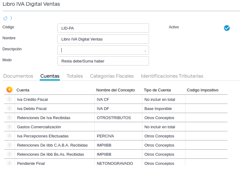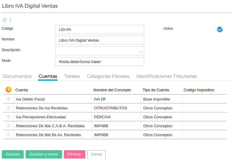 Agregar las cuentas que corresponden al IVA Débito Fiscal y las percepciones y retenciones que correspondan a las ventas.