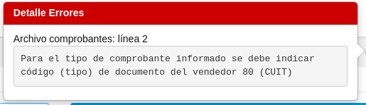 Los mensajes generales que emite el Portal IVA al detectar un inconveniente en el escaneo indica sobre qué líneas quedó la importación, tanto en el archivo Comprobante como el de Alícuotas, y el detalle de específico sobre la línea de Comprobante.