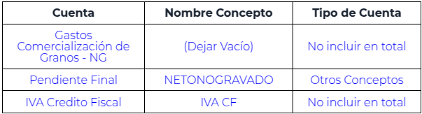 Si utiliza Liquidaciones de Compra de Granos se debe adicionar a la exposición fiscal las siguientes cuentas:
