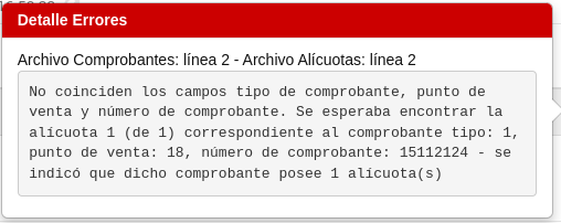 Se debe comparar ambos archivos txt, se sitúan las líneas correspondientes a cada archivo para comparar los números de comprobantes. Si el número de comprobante del archivo txt comprobantes coincide con la del archivo txt alícuota, entonces el inconveniente está en la transacción, según describe el error en AFIP.
