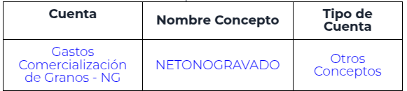 Los Gastos Comercialización que sean No Gravados (Tasa Impositiva 0%) deberá tener una cuenta contable independiente y que se use únicamente para tomar los gastos de comercialización en las liquidaciones de Granos.