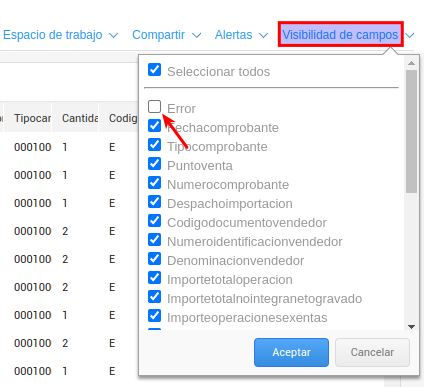 Una vez que hayamos verificado que no hay más errores, ir a Visibilidad de Campo y destildar la columna “Error”.