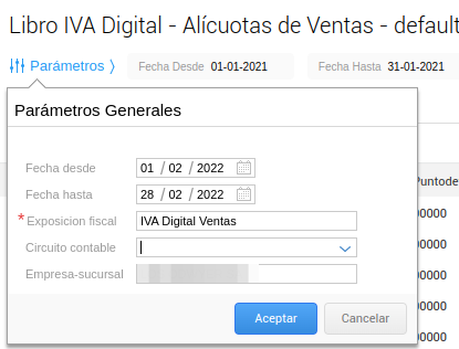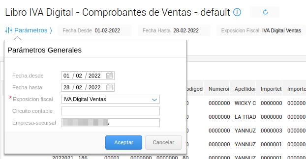 - Exposición fiscal: IVA Digital Ventas / RG3685 Ventas, según tenga configurada. (Utilizar el mismo que se utilizó en “Libro IVA Digital - Comprobante de Ventas”)