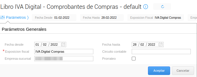 - Exposición fiscal: IVA Digital Compras / RG3685 Compras, según tenga configurada. (Utilizar el mismo que se utilizó en “Libro IVA Digital - Comprobante de Compra”)