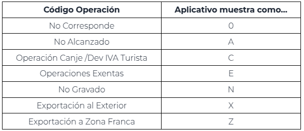 En todos los comprobantes tipo impositivo viene por defecto el código de operación “vacío”. Existen otros tipos de códigos de operación según su funcionalidad.