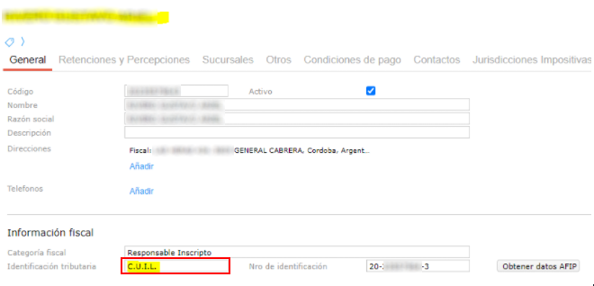 El tipo de identificación fiscal es incorrecto. Está registrado como Responsable Inscripto → CUIL. Esto se debe cambiar por CUIT.