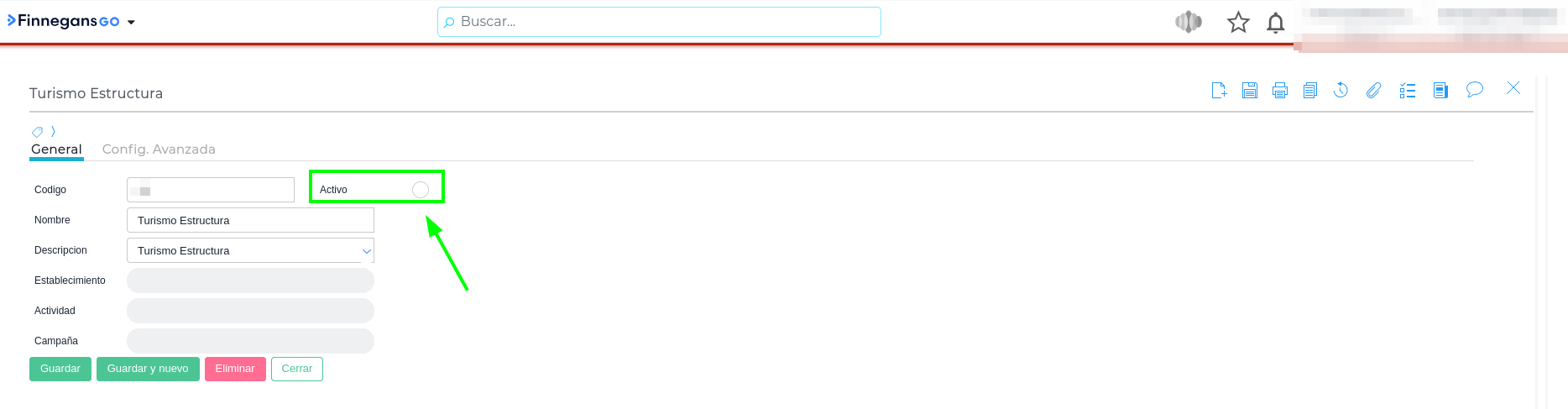 Buscar y seleccionar el Centro de Costo inactivo que se desea consultar (ejemplo: “Turismo Estructura”).