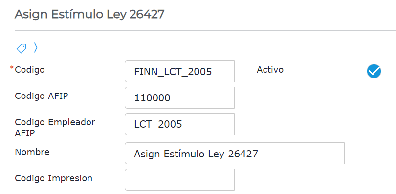 2- Acceder al concepto “Asign Estímulo Ley 26427” , cuyo código es FINN_LCT_2005.