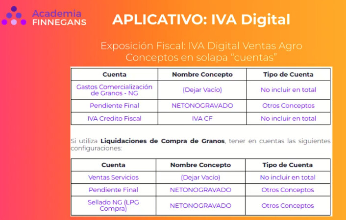 - Liquidación de venta de granos: IVA débito fiscal con concepto “IVA DF” y tipo “no incluir en cuenta”.