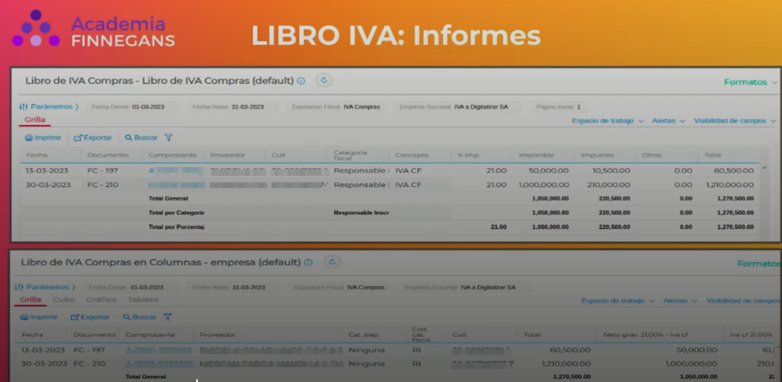 - Libro IVA Compras y Libro IVA Ventas (en columnas): Muestra una sola fila por cada transacción, pero con los distintos conceptos (base imponible, tasas impositivas, percepciones, retenciones, exentos, no gravados) distribuidos en columnas separadas. Este formato es más detallado y útil para obtener información específica y realizar controles.