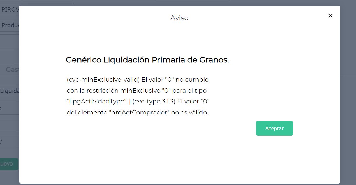 Al intentar obtener COE de una Liquidación de compra de granos, el sistema arroja el siguiente mensaje:
