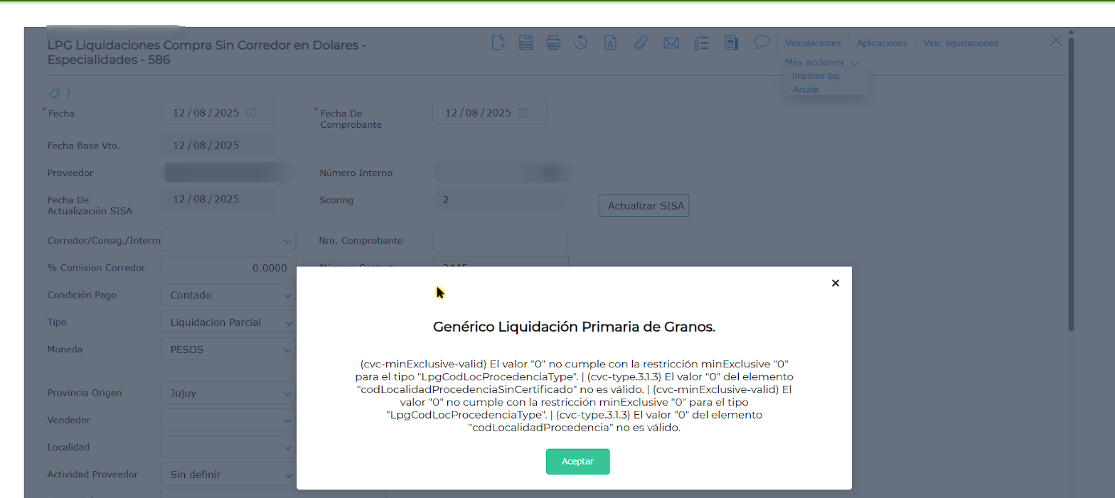 Al querer obtener COE de una liquidación de compra de granos, el sistema arroja el siguiente mensaje: