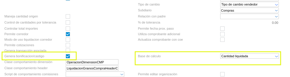 Ingresar al documento de liquidación de granos que se desea configurar e indicar el tilde en “Genera bonificación/castigo” para que se pueda seleccionar la “Base de cálculo” que corresponda