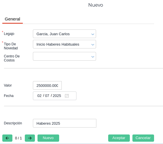 Tipo de novedad, buscar el concepto correspondiente (ej.: Inicio Haberes Habituales)