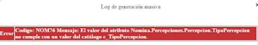Se realiza una liquidación de nómina y al querer timbrarla, el sistema emite un mensaje de error: "Código: NOM76 Mensaje: El valor del atributo Nomina.Percepciones.Percepcion.TipoPercepcion no cumple con un valor del catálogo c_TipoPercepcion.