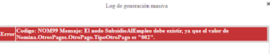 Se realiza una liquidación de nómina y al querer timbrarla el sistema emite el mensaje: Código: NOM99 Mensaje: El nodo Subsidio AIEmpleo debe existir, ya que el valor de Nomina.OtrosPagos.OtroPago.TipoOtroPago es “002”