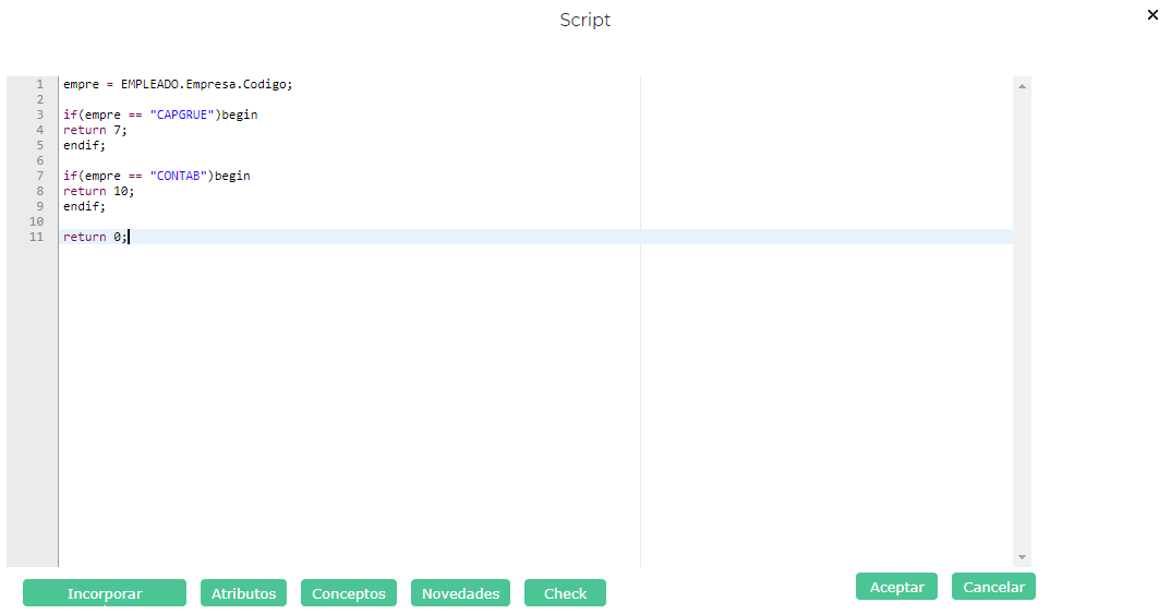 Una vez que conozcas el código de la empresa, deberas generar una condición en la fórmula del concepto donde, según el código, el valor del return será distinto:
