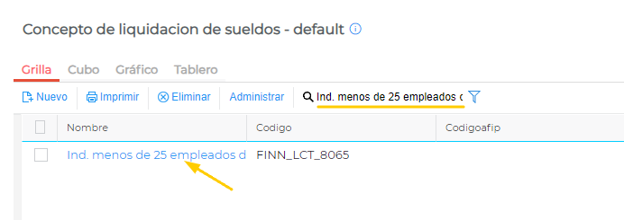 Paso 2: Buscar el concepto por su nombre “Ind. menos de 25 empleados detraccion” o por su código “FINN_LCT_8065” e ingresar.