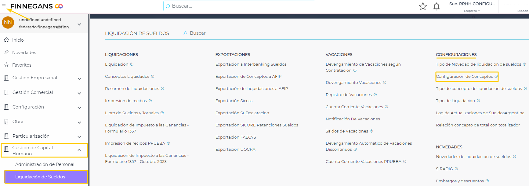 Paso 1: Ingresar al maestro de conceptos en Menú > Gestión de Capital Humano > Liquidación de Sueldos > Configuraciones > Configuración de Conceptos.