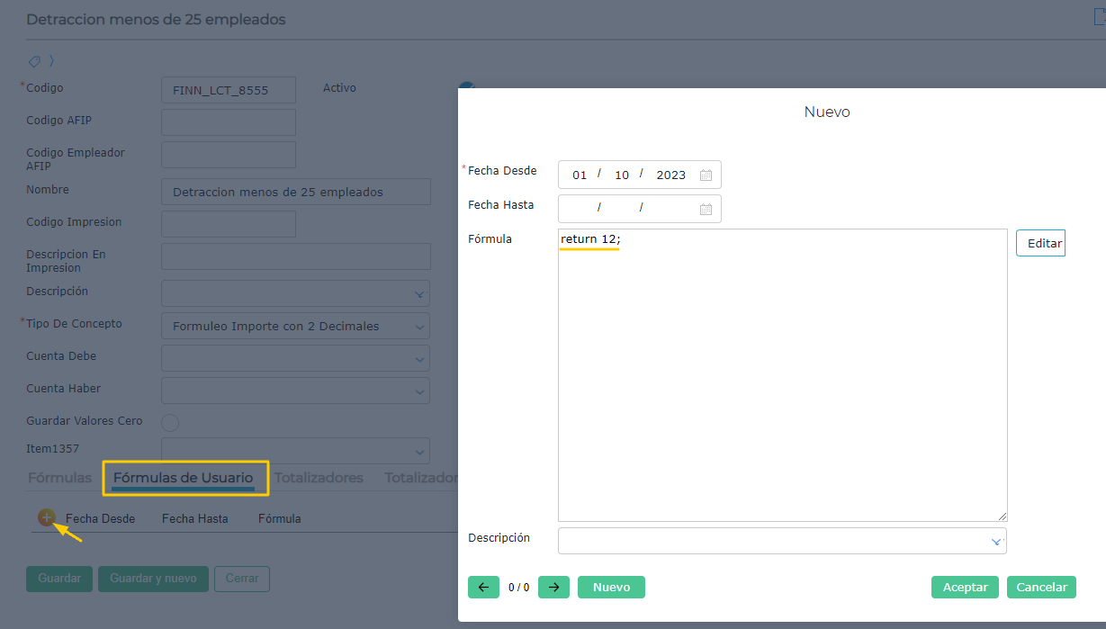 Paso 4: Aceptar y guardar el concepto, luego procesar la liquidación.