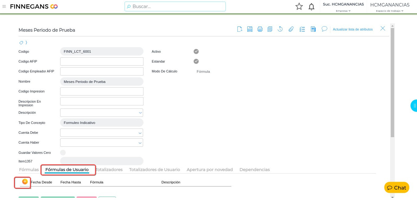 Dirigirse a la solapa Fórmulas de Usuario y apretar el botón “+”.