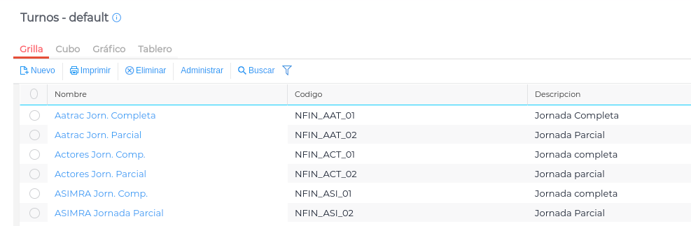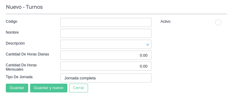 Se define como Turno al horario de trabajo que puede tener asignado un empleado. Los registros dados de alta en este maestro se utilizan en el maestro de empleados, en donde existe la opción de seleccionar el turno del empleado. Estos datos se usan en la liquidación de sueldos en determinados casos, por ejemplo, para obtener la cantidad de horas de trabajo de un empleado con jornada parcial.