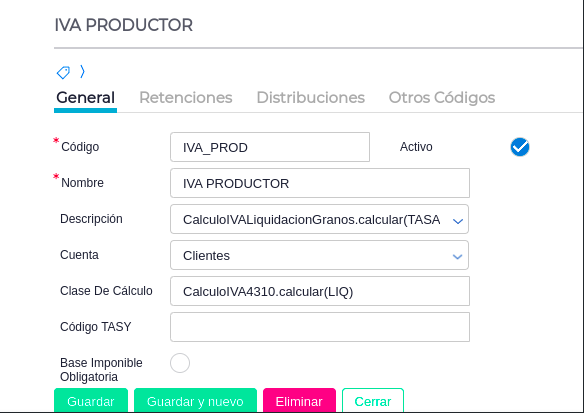- Al concepto IVA PRODUCTOR se le debe poner la siguiente clase de cálculo: CalculoIVA4310.calcular(LIQ)