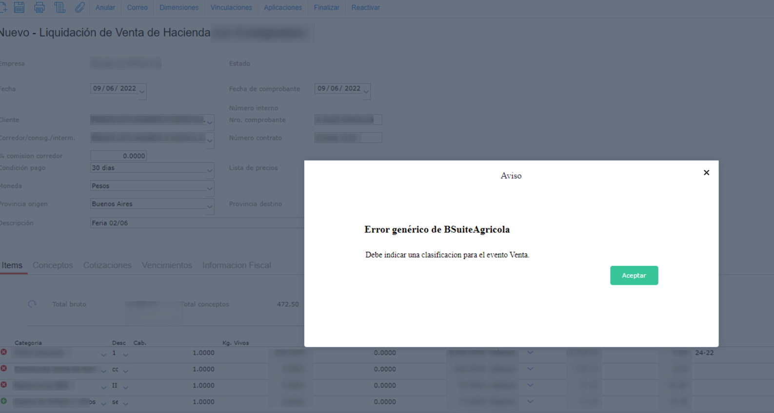 Al guardar una liquidación de venta de hacienda, el sistema arroja un error genérico de BSuiteAgricola: Debe indicar una clasificación para el evento “XXXX”