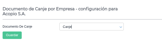 Luego, establecer el documento de canje creado como el Documento de Canje de la empresa. Para ello dirigirse a “Documento de Canje por Empresa”, seleccionar el documento creado y guardar: