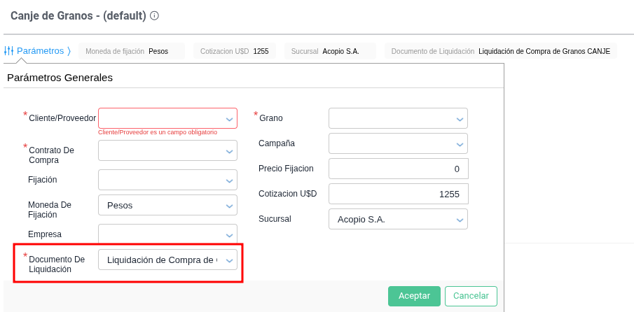 Al operar canje en “Canje de Granos”, el sistema propondrá el documento de liquidación establecido anteriormente según la empresa en la que estemos trabajando. En caso de querer cambiarlo, simplemente desplegar el selector y seleccionar otro documento: