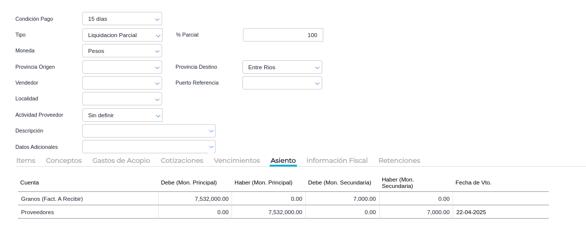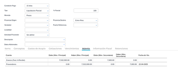 Se da de alta la liquidación de compra de granos con asistente ( para obtener COE ), o si se cargo sin asistente vincular traslados y contratos.