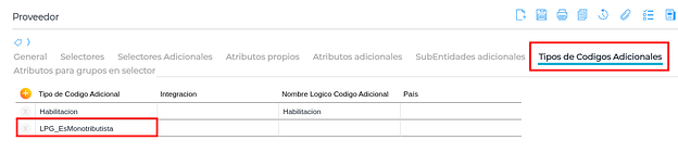 - Generar nuevo código adicional en la view de proveedores. Para ello dirigirse a Diccionario de Datos → Buscar Proveedor → Tipos de Códigos Adicionales → Agregar el código LPG_EsMonotributista: