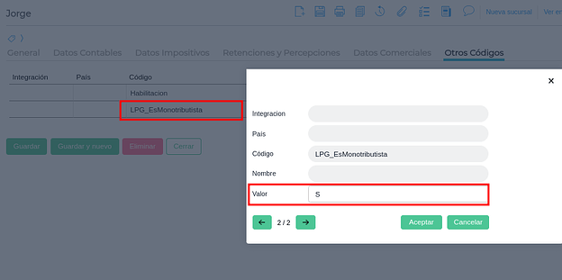 - Agregar código adicional en proveedor: el mismo debe ser una “S” en mayúscula.